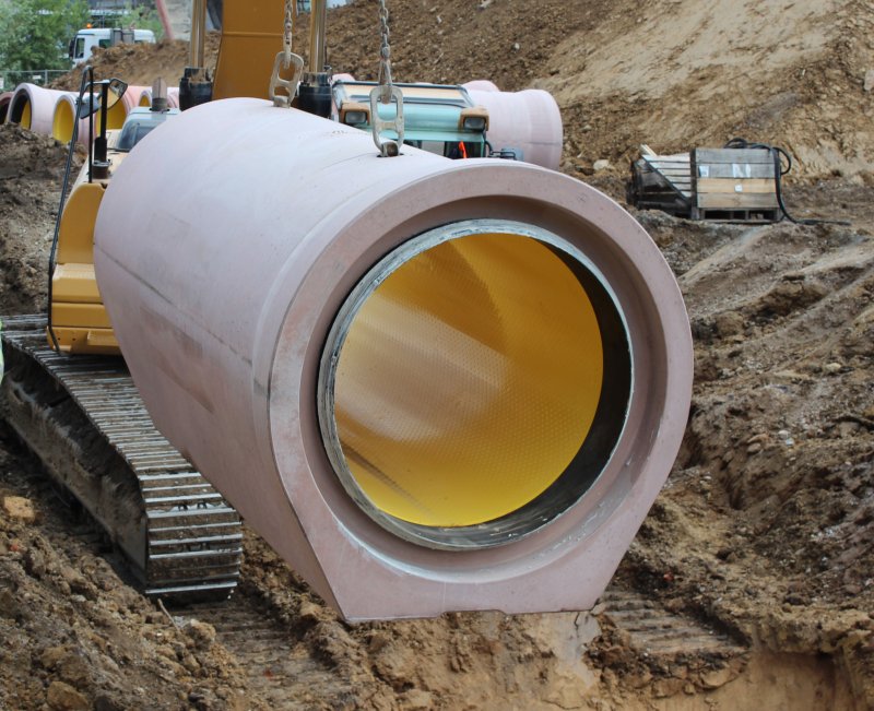 In einem mit Blick auf Umwelt- und Gewässerschutz anspruchsvollen Umfeld kamen die neuen, vom Betonwerk Müller entwickelten Vortriebsrohre mit einer Innenauskleidung aus PEHD versehenen Vortriebsrohre zu ihrem ersten Baustelleneinsatz.